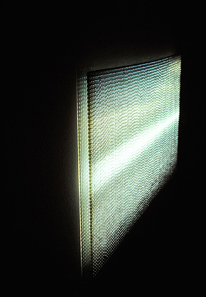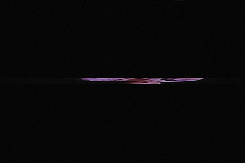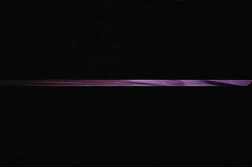 Inspired by a sequence from a Dario Argento film where a young woman takes apart a vhs videotape, the images in this video projection installation were created by using the surface of vhs videotape itself as a reflective screen. Captured from the surface of the videotape, the inverted and compressed images were then projected again in the same physical ratio as the original videotape but on much larger scale. Projected into the interior of a horizontal screen embedded within the wall itself, the moving, abstracted video projection appears pseudo-anamorphic, delaying recognition and emphasizing the inherent codification and indecipherability of images.
