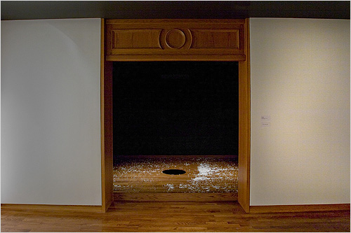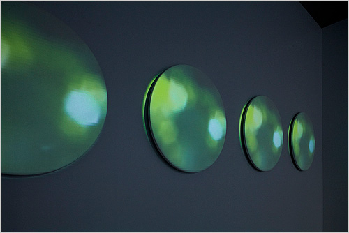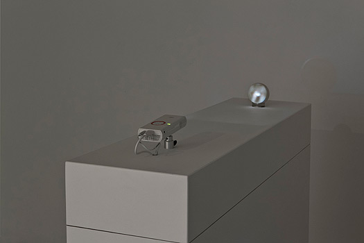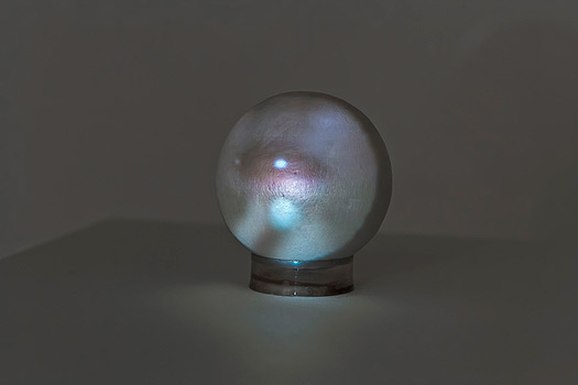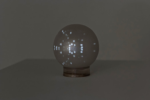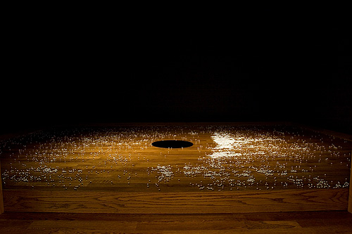 This installation is adapted from a scene from an Alain Robbe-Grillet novel. Every minute, a single glistening pearl is released from a hidden mechanism, dropping to the centre of a circular black glass mirror, meeting its own image double with a resonant punctum of sound. Over the duration of the work’s exhibition, 10,000 pearls accumulate; as more and more pearls descend, they move around the space as they collide with the walls and each other, providing a constantly shifting terrain of movement, accretion, and sound.