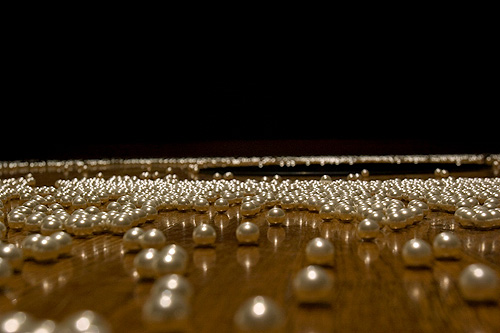 pearlmaiden is a video installation work composed of three main elements - a continuously looping video projection, a composed audio soundscape, and a floating projection screen constructed entirely from replica pearls, where each pixel in the screen size ratio is represented by a single pearl. Adapted experimentally from the fourteenth century medieval text Pearl, this work delves into an ongoing fascination with the (literary) pearl and the video screen as transformative metaphorical objects; the pearl, as it engages with notions of the female/the feminine, and that has a specific correspondence with the eye and the pixel, and the screen, which is circumscribed by both, all transforming into the liminal space of dream objects and images that dissolve in a flux of transmutation, transgression and multiplicity.