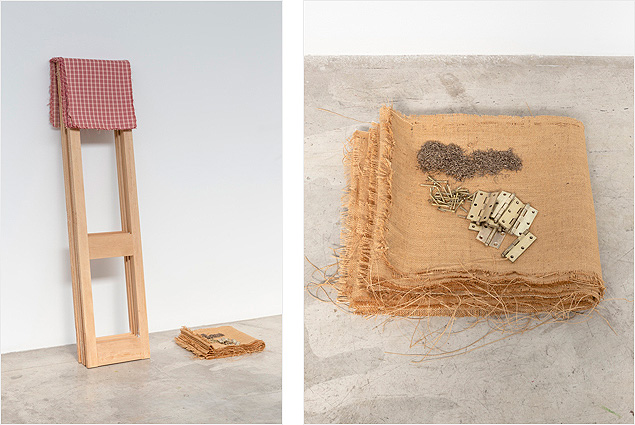 Wood, fabric, burlap, brass hardware and staples