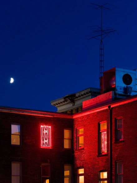 Commissioned by The Gladstone Hotel in Toronto, this permanent installation memorializes the transformation of this historic building from rooming house to artist-run hotel, by combining the surrounding neighborhood's domestic ornamentation/armament with film noir's recurring motif of the seedy urban hotel. |