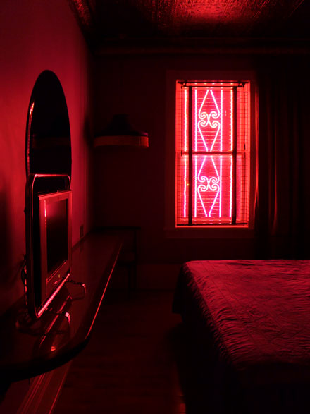 Neon, mirror, custom furniture & light fixtures, textiles, tin ceiling, blinds