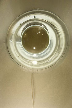 aluminum, enamel paint, clear coat, plexiglas, + 2 spun aluminum stools and aluminum chain