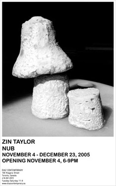 Zin Taylor, recently included in the Powerplant exhibition ‘Dedicated to you, but you weren’t listening’ complements Hrabluik’s work with his own drawings, included in Nub. His works are delicate accretions of pencil marks, charting the meandering and delicate forms of dirt clumps arranged to form words, phrases. Spelling out the names of tracks on the album by a Japanese musician to whom Taylor created a video homage, these drawings marked the inception of that video piece. Studies, preludes, companion works, the careful suggestion of a biological material ushered into the realms of the linguistic and the aural, Taylor’s drawings record different levels and means of interpretation.