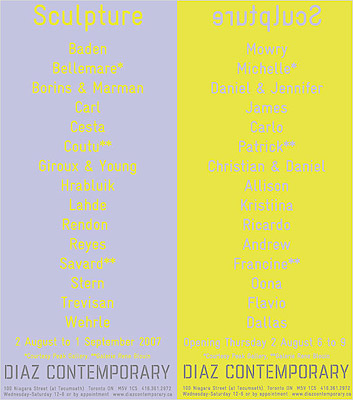 The Group Sculpture Show at Diaz Contemporary includes a selection of works by sculptors working in Toronto, Montreal, Vancouver, New York and Mexico City. The show presents a wide spectrum of stylistic, formal and conceptual tendencies and highlights diverse approaches to materials and techniques that challenge preconceived notions of contemporary sculpture-making.