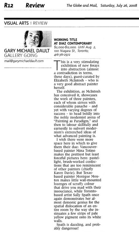 12 July to 02 August 2008 Working Title: Monique Mouton, Sally Spath & Mina Totino Curated by: Elizabeth McIntosh