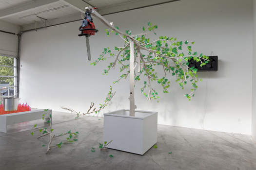 17 October to 14 November 2009 bgl New Sellutions 3/10 bgl Pinocchio chainsaw, clamp, plywood, vinyl, paint; with pair of Speaker Fans: fan, wood, plastic 112" x 115" x 126" fan: 16" x 32" x 19" 2009