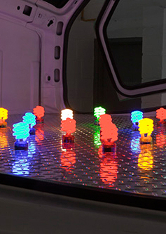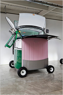 kitbashed Ford Econolines, various car parts, grain silo caps, perforated water barrels, lighting and trailer systems