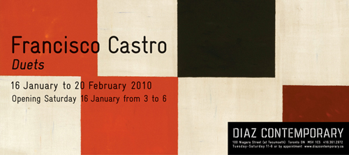 Considered the foremost abstract painter of his generation in Mexico, Francisco Castro continues to exhibit widely in North America. His work is held in numerous public and private collections including: The Metropolitan Museum of Art, The Museum of Modern Art (New York City), the San Antonio Museum of Art, The Museum of Modern Art (Mexico City), Museo Rufino Tamayo (Mexico City) and The Jumex Collection (Mexico City). Recent solo exhibitions include Duet: Recent Paintings at Gebert Contemporary, Santa Fe, NM in 2007 and The Red, Black and White at Howard Scott Gallery in New York in 2009.