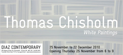 Thomas Chisholm is a graduate of the Nova Scotia College of Art and Design (BFA) and the University of Victoria (MFA). He has received national attention and in 2008 was the winner of the BMO 1st Art Award for Nova Scotia. Recent exhibitions include Positive Negative (solo exhibition) at Anna Leonowens Gallery in Halifax, Nova Scotia (2008), 6 at the University of Victoria (2010) and RAW at Deluge Contemporary Art (2009).