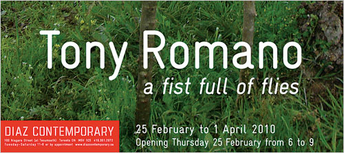 Diaz Contemporary is pleased to present Tony Romano’s third solo exhibition with the gallery. Featuring photography, music, film, sculpture, and collaged work, a fist full of flies reflects the artist’s ongoing curiosity about narratives and their relationship to reality. The works, both personal and cinematic, experiment with the potentials of living cultural forms, and test the structures of story-telling media to affectionately ask questions and paint pictures about our real and imagined selves. He demonstrates a playful interest in the ability of formal codes to reflect the human condition.