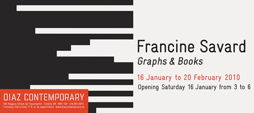 Francine Savard is a Montreal-based artist. After studying graphic design at the Royal College of Art in London, she earned her Master’s in Visual Arts from Université du Québec à Montréal in 1994. The first retrospective of her work was recently presented by the Musée d’art contemporain de Montréal. Her work can be found in the collections of the National Gallery of Canada, the Musée national des beaux-arts du Québec and the Musée d’art contemporain de Montréal.