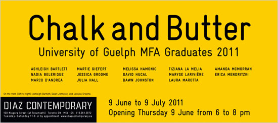 Diaz Contemporary is pleased to present Chalk and Butter, a group exhibition of the 2011 graduates of the MFA program at the University of Guelph. This show, which includes work by everyone in the class, demonstrates the breadth of issues, material concerns, and experiments that have been undertaken by these emerging artists.