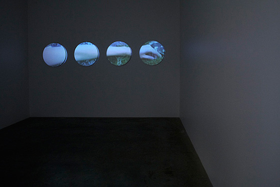 Dara Gellman Reaching Out single channel video projection with stereo sound, 8-minute loop four MDF projection screens, 28” diameter (11’4” total width) 2008