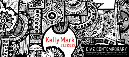 In 33.333333, Diaz Contemporary presents Kelly Mark's most recent Letraset drawing. The ten-panel piece spans 33.333333 feet by 32 inches – the entire length of the back gallery. Mark's Letraset drawings are an ongoing practice, in which the artist meticulously creates intricate, tangled forms using letters, numbers, symbols, and lines from sheets of Letraset, ‘instant lettering’.