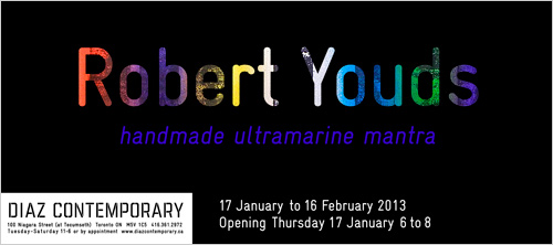 Diaz Contemporary is pleased to present an exhibition by Victoria-based artist, Robert Youds. handmade ultramarine mantra is a body of new paintings that continue to explore Youds’ interest in light, colour and existential concerns of the urban condition.
