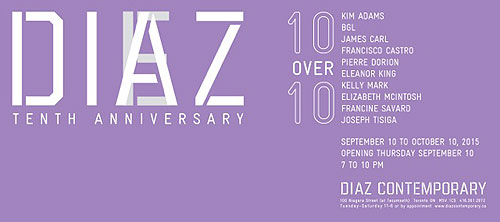 Diaz Contemporary is delighted to present its 10th anniversary exhibition, 10 over 10, opening on Thursday, September 10 from 7 to 10 pm. Since September 2005, the gallery has exhibited the work of over 100 artists, ranging from emerging talent to established practitioners, consistently providing a forum from within which generational and geographical dialogues could occur, and assembling through its program a primer for contemporary art practice, through both a local and global lens.