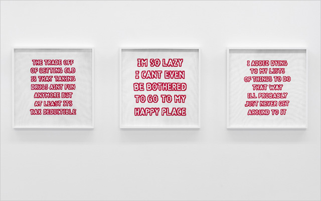 1 April to 30 April 2016 Kelly Mark Curmudgeon 17/26 Kelly Mark The Trade Off, My Happy Place, Strategy for Immortality Cross-stitch on linen 24” x 24” each Edition: 2 + 1 AP each 2016