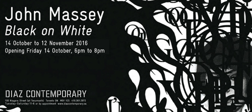 On Friday October 14, Diaz Contemporary is pleased to present John Massey's Black on White, a suite of ten large-scale digital prints completed between 2012 and 2016. Massey's 40-year practice has long privileged collage technique, from early print works that layered distinct sets of symbols and images into one field, to digitally integrated mise-en-scènes where unlikely objects are introduced into architectural interiors and landscapes.